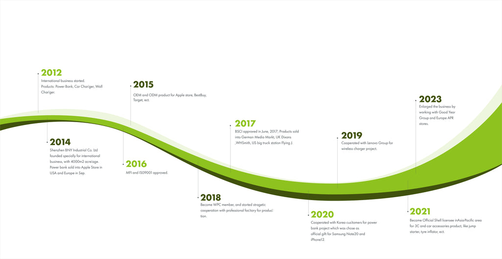 In 2020, BNY became Official Shell Licensee in Asia-Pacific Area for New Energy, Car Accessories and 3C Products. Then we enlarged our product line to Portable Power Station, Jump Starter, Tire Inflactor ect.